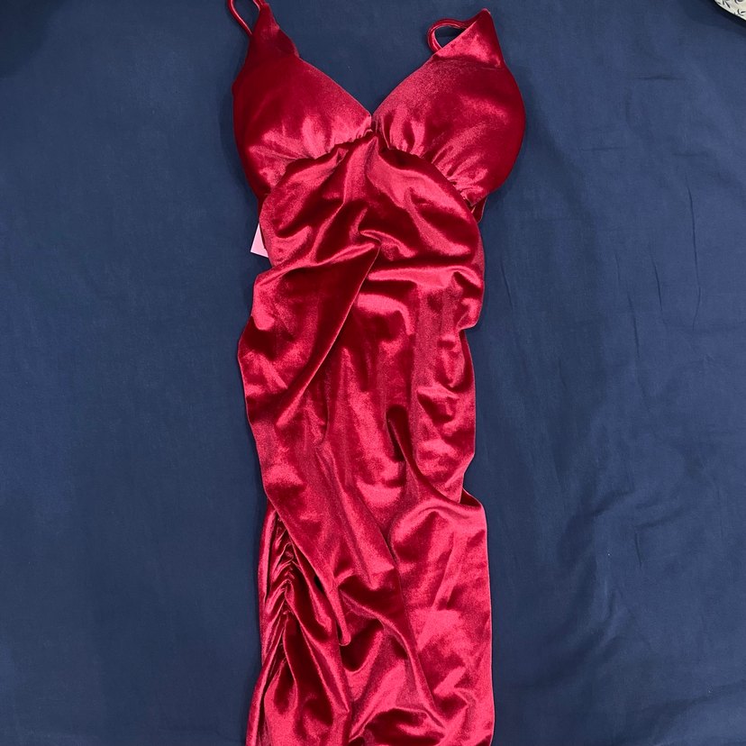 Parlak kırmızı kumaştan, drapeli ve askılı uzun, v yaka, dar kesim abiye elbise. Bağlama desenli, gösterişli parti tarzı için uygundur. ✨ Göğüs kısmı kendiliğinden pedlidir.