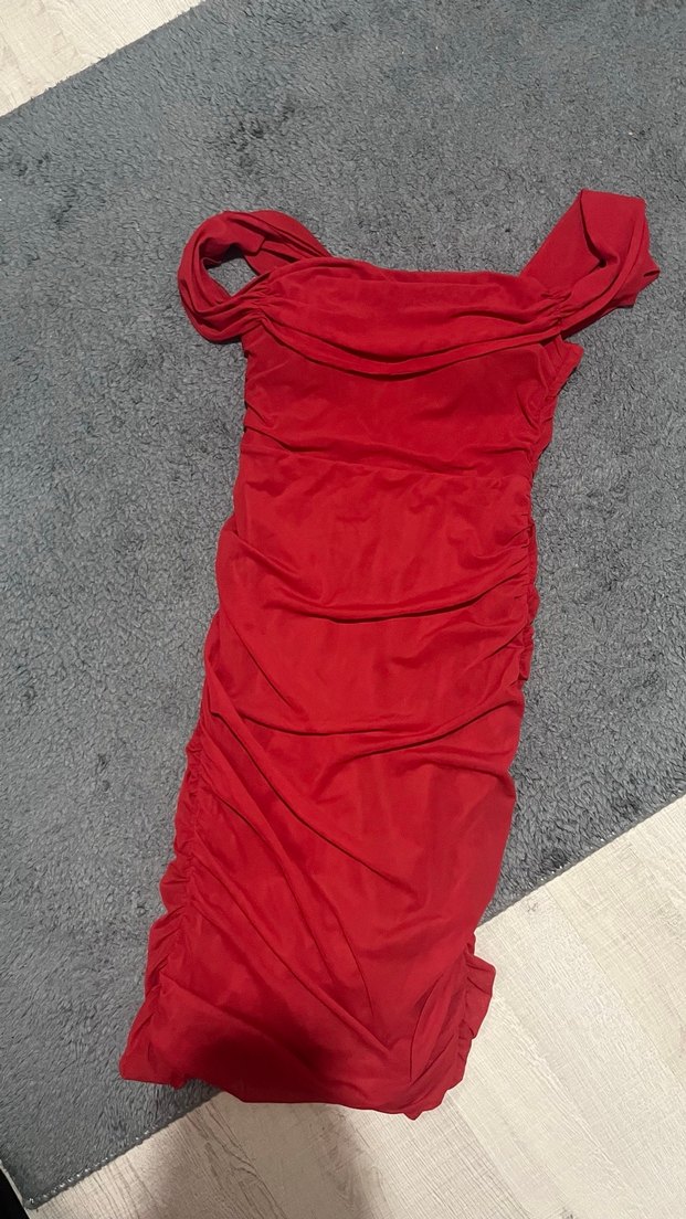 Kırmızı, drapeli ve tek renk uzun abiye elbise. Drapeli tasarım ve kayık yaka ile fit kesim, cesur ve minimal stil için uygun. Kollu değil, parti için ideal.
