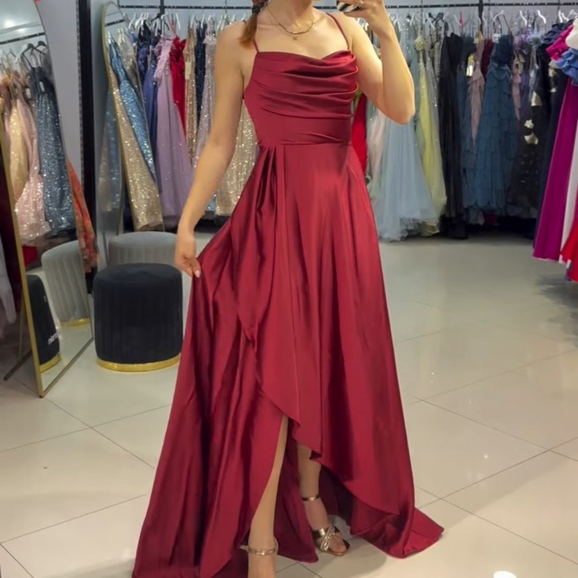 Parlak kırmızı kumaştan, drapeli ve askılı uzun abiye elbise. 50 bedendir