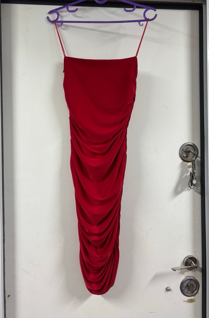 Drapeli detaylara sahip, straplez ve kısa kırmızı abiye elbise. Minimalist ve çağdaş tasarımıyla parti için uygundur.