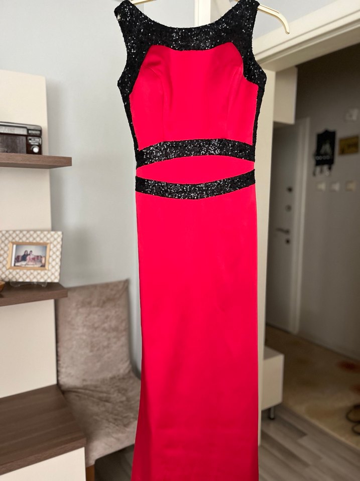 Kırmızı, drapeli, uzun ve dar kesim abiye elbise, tekne yaka ve kolsuz. Siyah ışıltılı detaylarla renklendirilmiş, romantik akşamlar için ideal. Kullanmadığım için satıyorum. Ürün nişan için sadece bir akşam giyilmiştir sıfır ayarında yenidir herhangi bir deformesi lekesi yırttığı yoktur artık giymeyeceğim ve tarzım olmadığı için satıyorum.