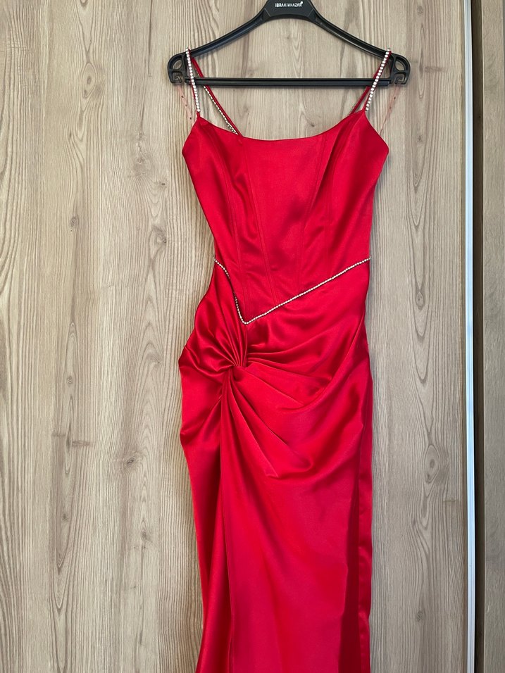 Kırmızı parlak kumaştan, drapeli, uzun ve dar kesim abiye elbise, çok güzel bir model ön kısımdaki taşı kendim diktim bir sorunu yok boyunu kestirdim bir kere giydim 160 boy Keikei marka