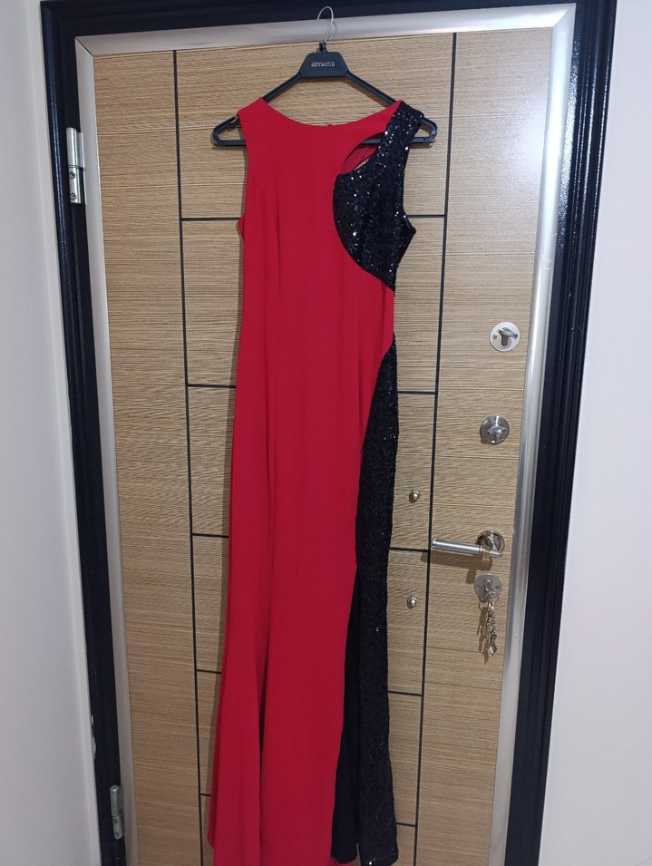Kolsuz, vücuda oturan uzun abiye elbise, straplez tasarım ve drapeli detaylarla birlikte koyu payetli desenli kontrast panel içerir. Romantik akşamlar için uygundur.