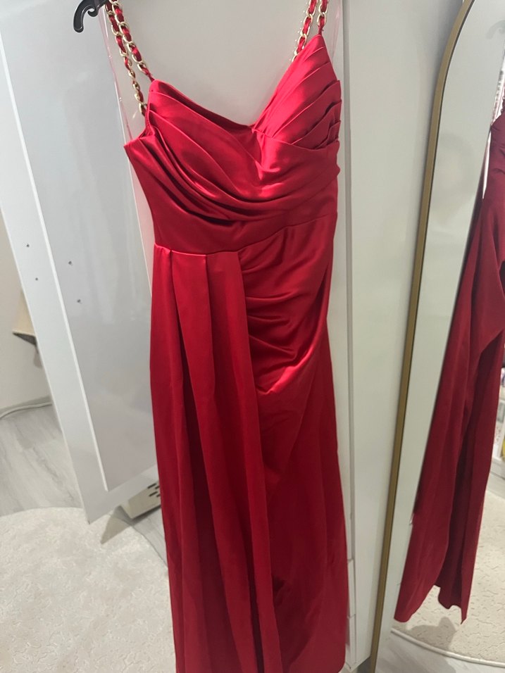 Kırmızı Drapeli Uzun Abiye Elbise