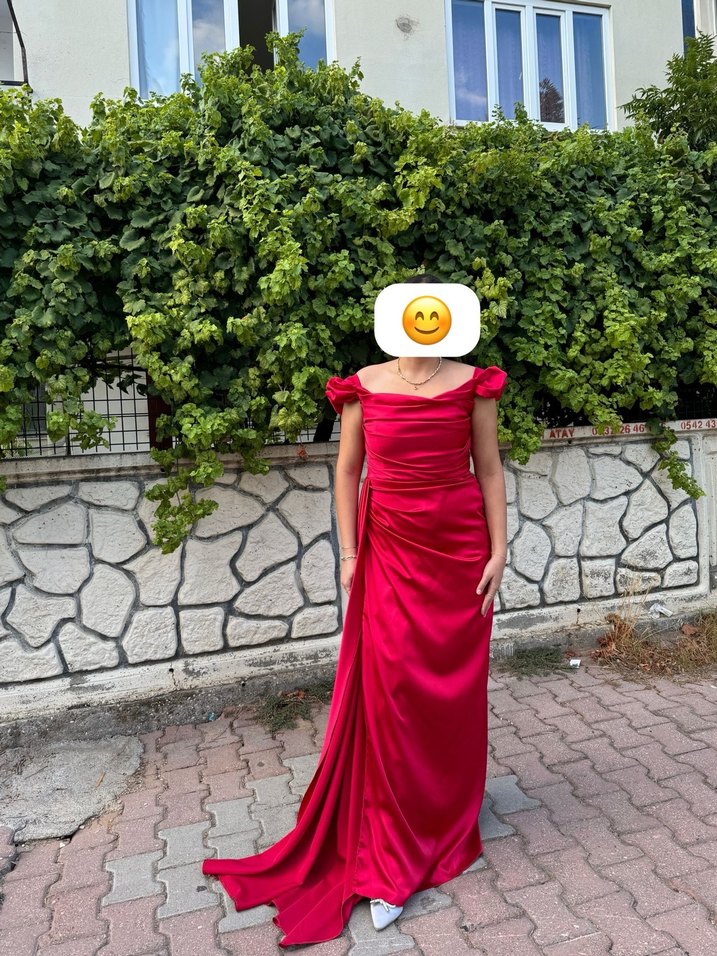 Kırmızı, drapeli, uzun ve kolsuz abiye elbise. Teknolojik kesimi ve kayık yaka detayıyla klasik şıklığı yansıtır. Düğünler için uygundur.