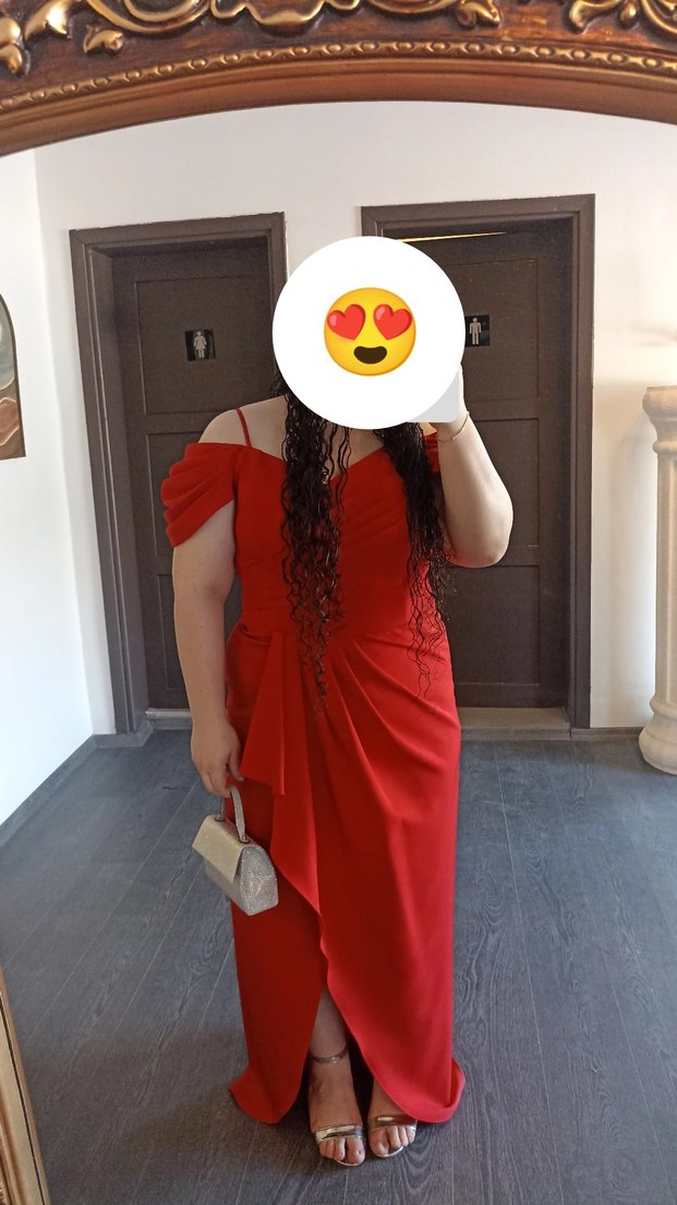 Kırmızı Drapeli Uzun Abiye Elbise