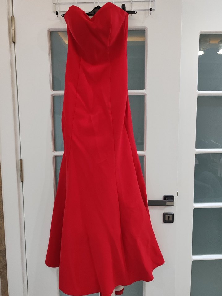 Drapeli, straplez, kırmızı parlak kumaştan uzun ve dar kesim abiye elbise. Düğün için modern klasik ve minimalist tarzda, kolsuz tasarım.