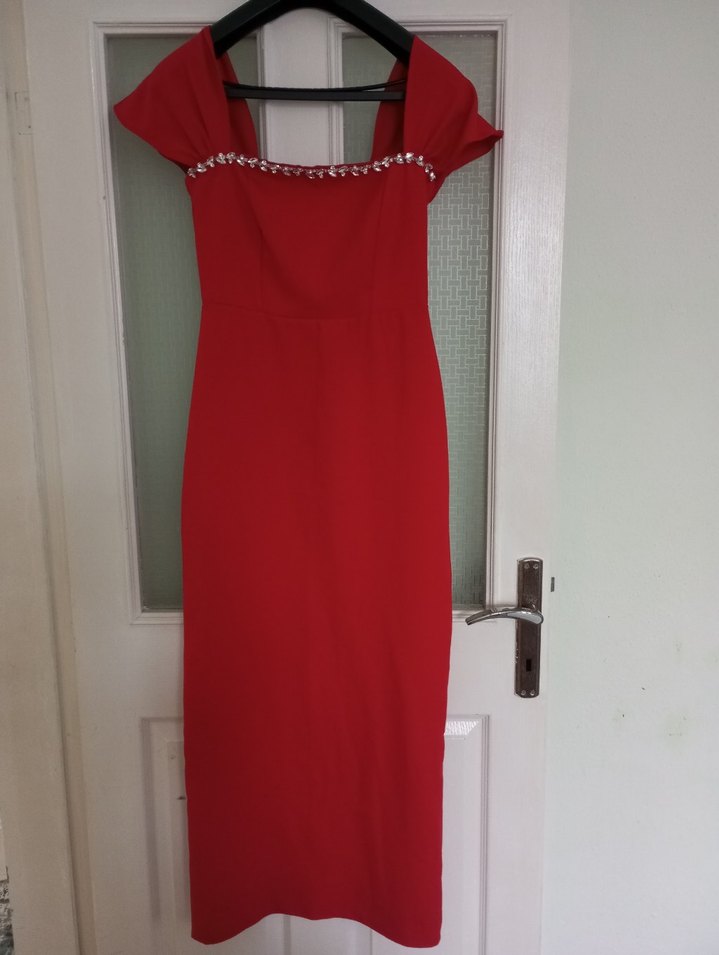 Kırmızı parlak kumaştan, drapeli ve dar kesim uzun abiye elbise. Kayık yaka ve kolsuz astarsiz