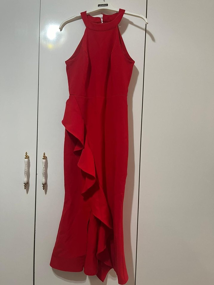 Koyu kırmızı, drapeli detaylı, yüksek yakalı, kolsuz ve vücuda oturan uzun elbise, şık ve modern bir görünüm sunar.