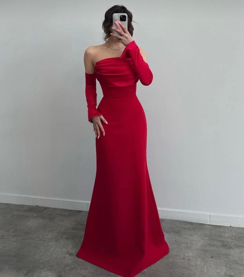 Parlak kırmızı kumaştan, drapeli ve straplez yaka detaylı, uzun kollu, vücuda oturan uzun abiye elbise. Düğünler için uygun. sadece bir kez giydim temiz normalde 36-38 bedenim ama kalıbı dar ürünün