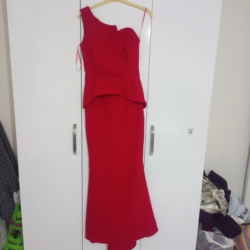 Kırmızı, drapeli, uzun ve straplez abiye elbise, modern klasik tarzda ve minimalist görünümlü, düğünler için uygun.