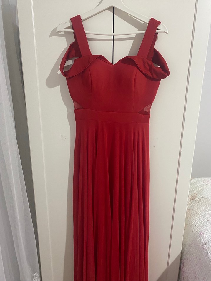 Kırmızı Drapeli Uzun Abiye Elbise - Görsel 1