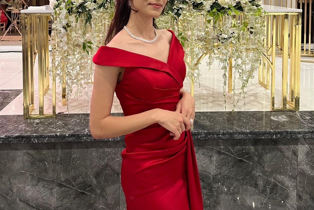 Kırmızı Drapeli Uzun Abiye Elbise
