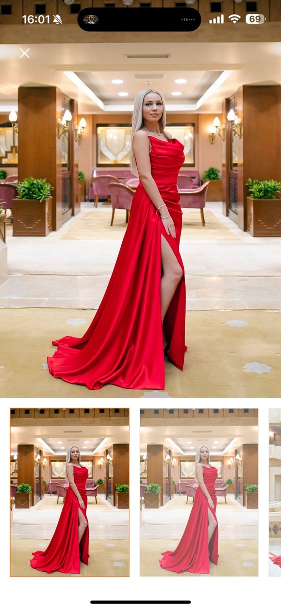 Cesur, kırmızı parlak renkte, drapeli ve straplez yakalı, uzun ve yırtmaçlı abiye elbise. Düğünler için modern ve göz alıcı bir seçenek. ✨