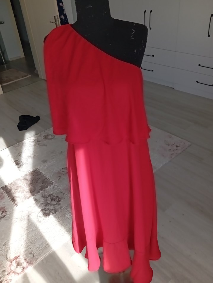 Kırmızı uzun abiye elbise, drapeli tasarımı, straplez yakası ve ince askılarıyla bol kesim sunar. Cesur ve çağdaş bir stil için idealdir. ❤️