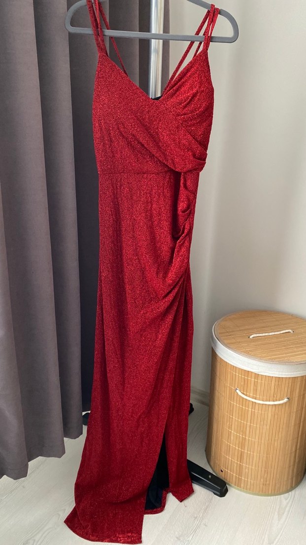 Kırmızı Drapeli Uzun Abiye Elbise