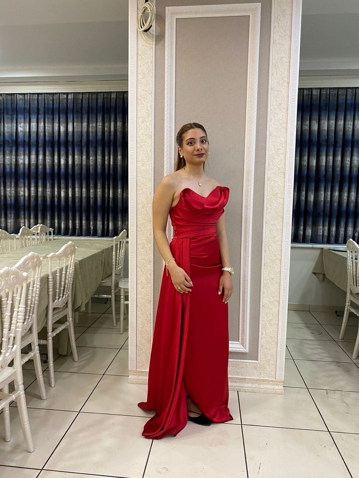 Parlak kırmızı renkte, drapeli ve straplez uzun abiye elbise. Regular kesim ve kolsuz tasarımıyla düğün ve özel davetler için uygundur.