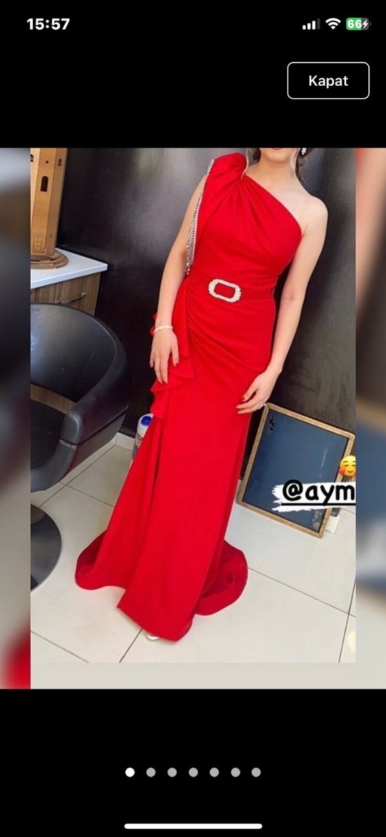 Kırmızı, askısız, drapeli ve kemer detaylı, uzun, vücuda oturan abiye elbise. Modern klasik tarzda, düğün için uygun, kolsuz tasarım. Ürün bir kere giyildi temiz depo yırtık yoktur.163 boyla 50 kiloyla giyilmiştir