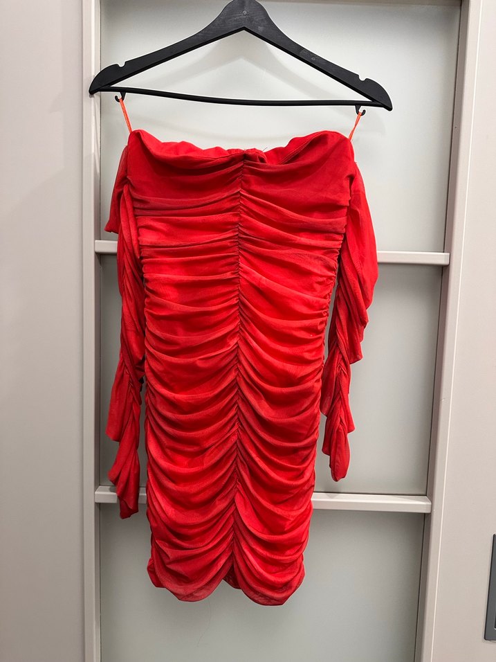 Kırmızı, drapeli ve parlak kumaştan yapılmış, askılı kolları ve straplez yakası olan uzun, dar kesim abiye elbise. Partiler için uygundur.✨