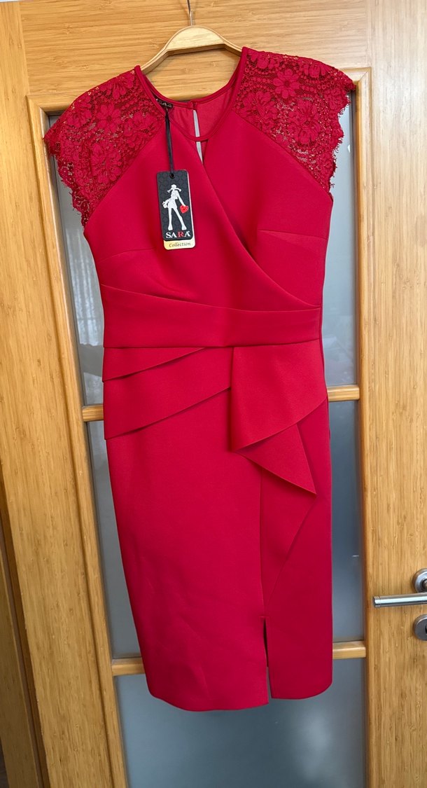 Koyu kırmızı, v yaka ve kolsuz tasarıma sahip, drapeli ve dantel detaylı, klasik şıklıkta uzun abiye elbise.