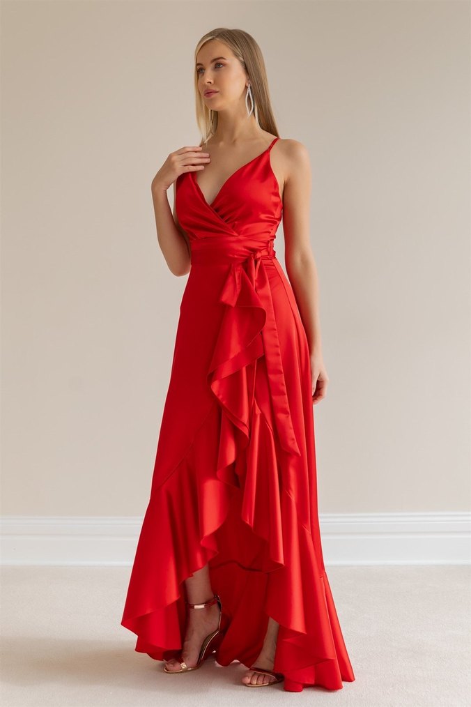 Kırmızı Drapeli Uzun Abiye Elbise