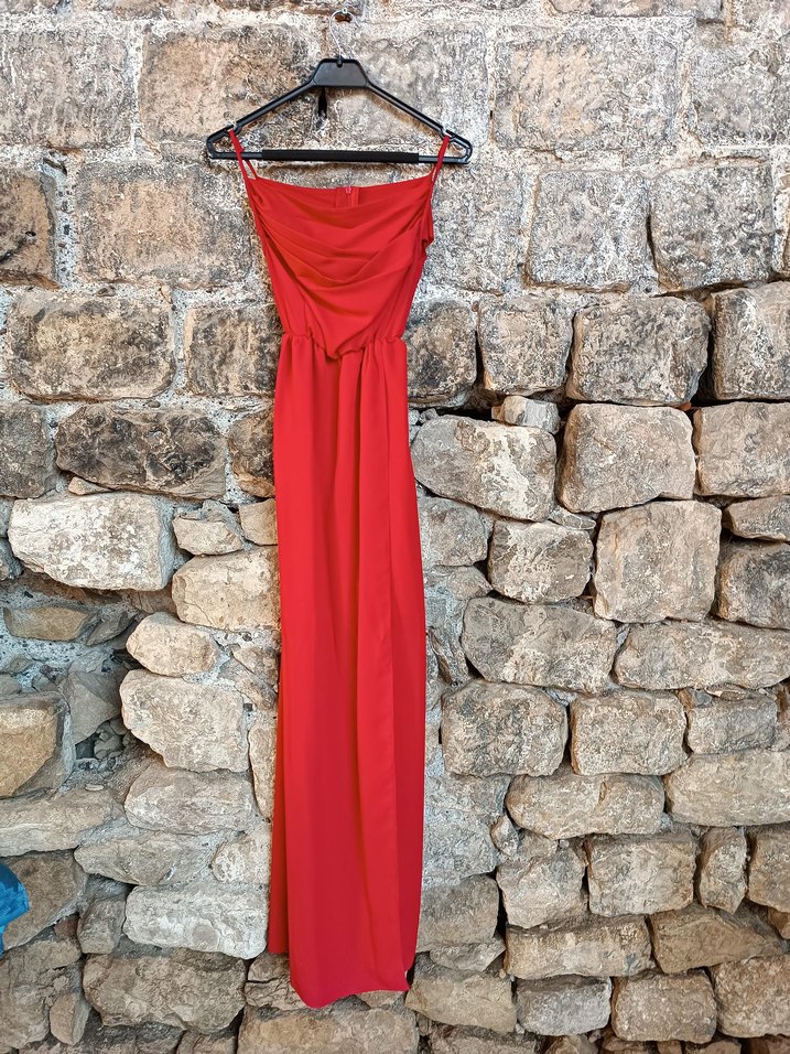 Özel dikim abiye hiç kullanılmadı. Drapeli, straplez ve kolsuz uzun elbise, yumuşak sentetik kumaştan, koyu kırmızı renkte. Romantik akşamlar için uygun.