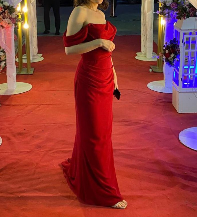 Kırmızı Drapeli Uzun Abiye Elbise