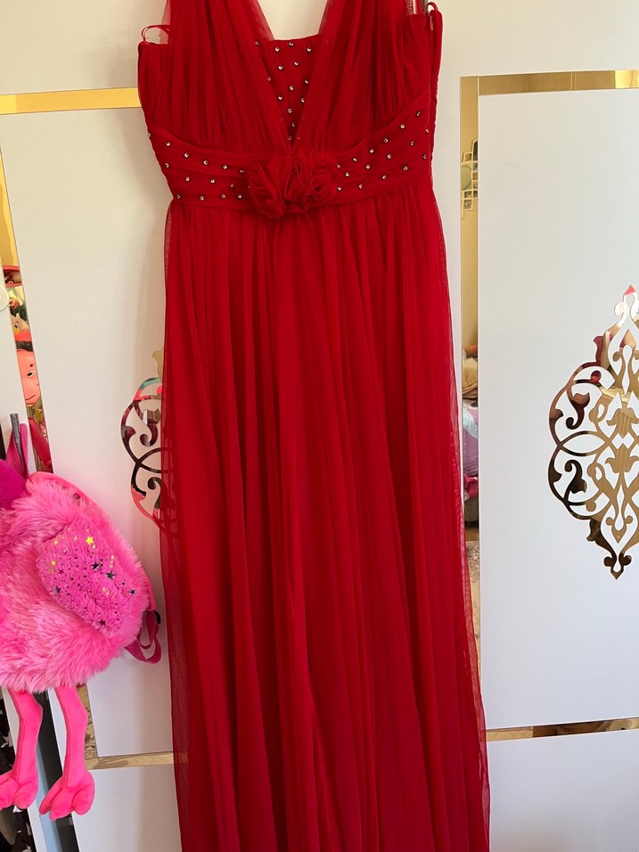 Parlak kırmızı renkte, drapeli ve askısız uzun abiye elbise. Bel kısmı taşlı detaylarla süslenmiş, klasik ve şık bir model.