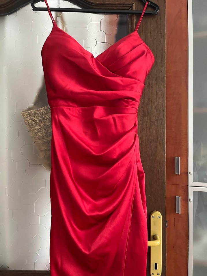 Drapeli, V yakalı ve ince askılı kırmızı parlak uzun abiye elbise, modern klasik tarzda ve romantik buluşmalar için uygundur. Mezuniyet için alındı bir kez giyildi. 6500 almıştık