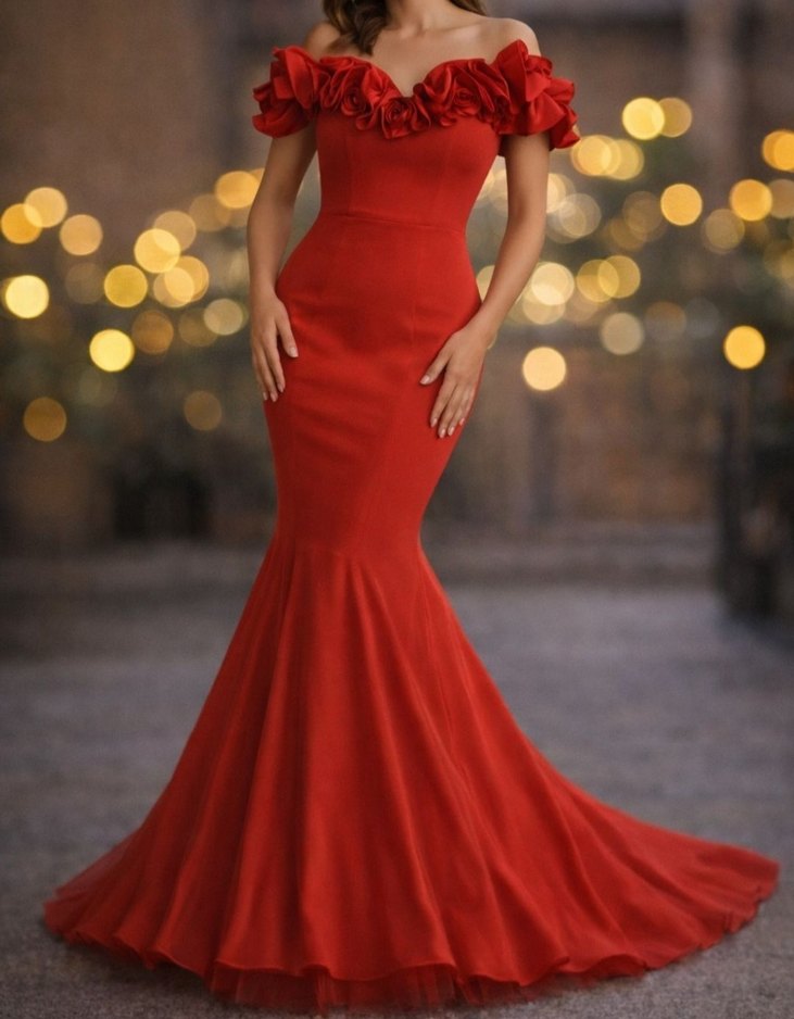 Kırmızı, drapeli, omuzları açık, fırfırlı detaylı, uzun ve dar kesim abiye elbise. Modern klasik tarzda, kolsuz ve şık bir tasarım. Likralı. Etek uçları içten tüllü. 1 kez giyildi. Defosuz.