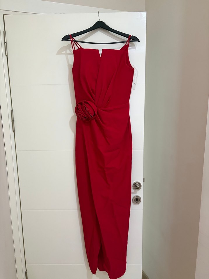 Kırmızı Drapeli Uzun Abiye Elbise