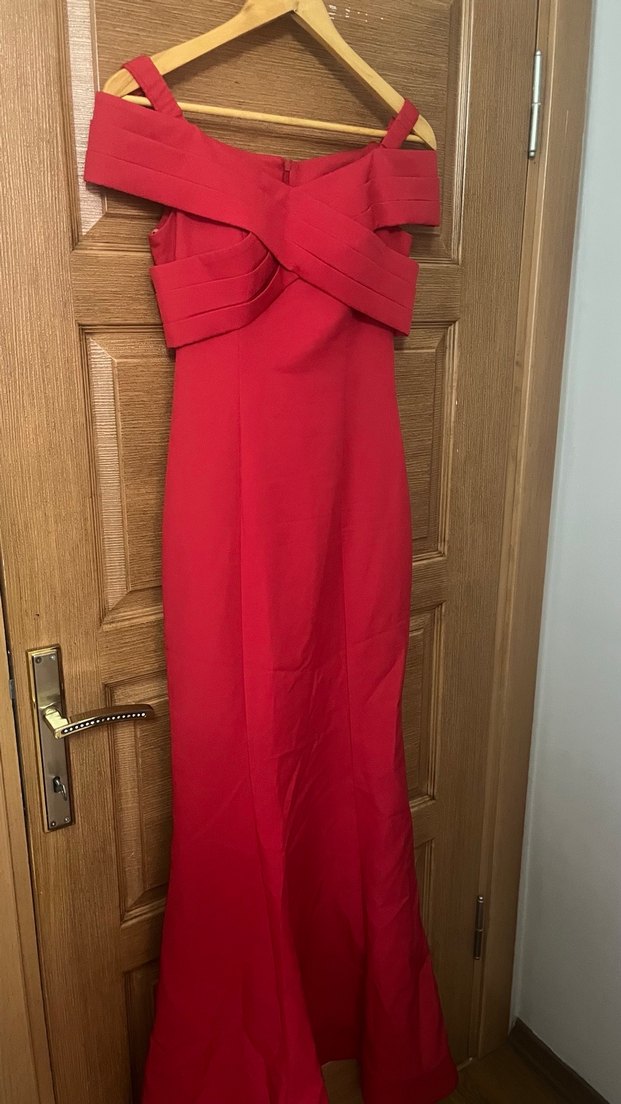 Klasik ve modern çizgiler taşıyan, drapeli uzun kırmızı abiye elbise. Kayık yaka ve askılı detaylarıyla şık bir görünüm sunar. ✨