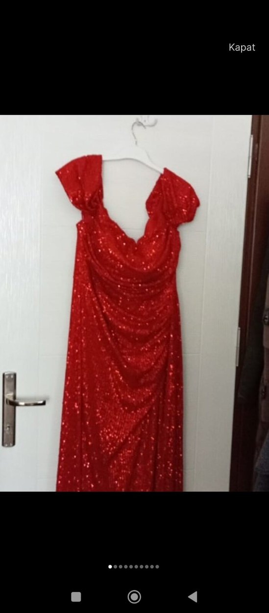 Parlak kırmızı, drapeli uzun abiye elbise. V yaka, kolsuz ve vücuda oturan kesim, gösterişli parti tarzı için uygundur. ürünü 1 defa kullandım ablamın düğününde sıfır ayarında duruyo