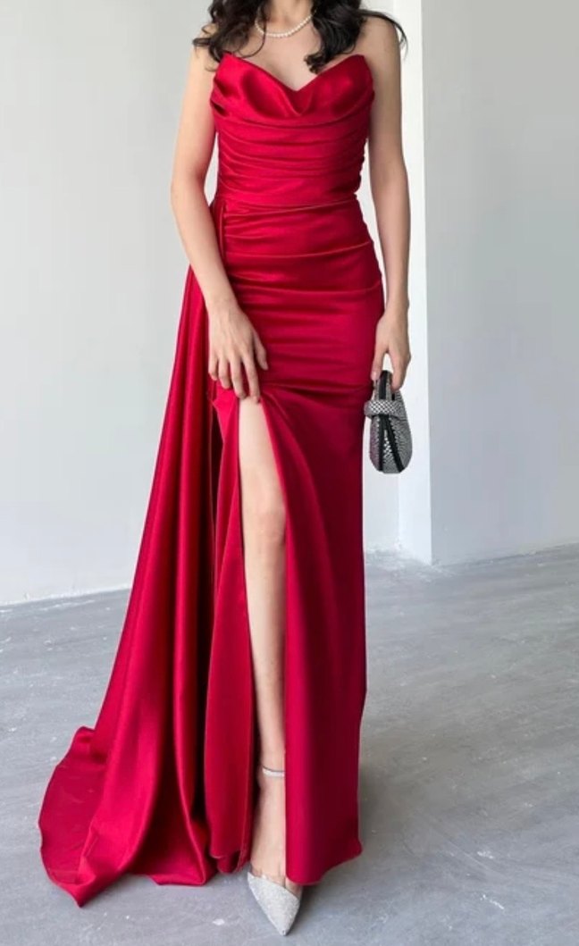 Kırmızı, drapeli, straplez yaka kaliteli saten kumaş uzun abiye elbise. Parlak kumaşı ve yırtmaç detayıyla özel günde giymek için uygundur.