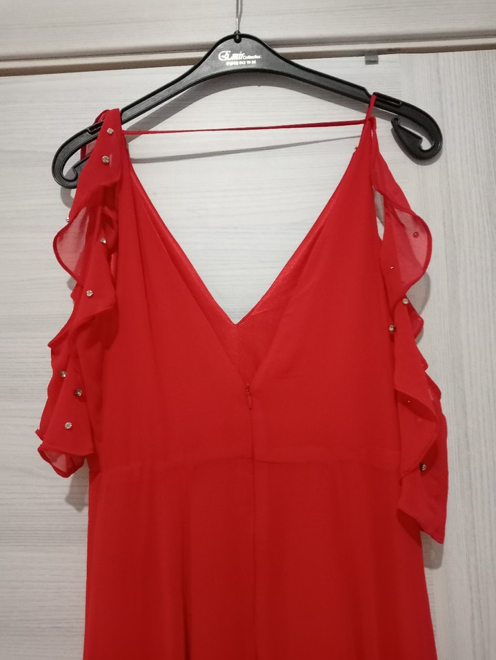 Kırmızı renkte, V yakalı ve drapeli tasarıma sahip uzun abiye elbise. Askılı kollu, bol kesim ve parlak kumaftan, göz alıcı parti elbisesi. ✨