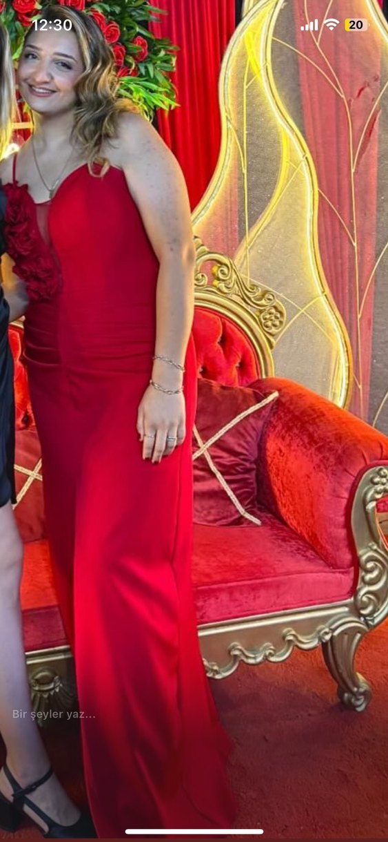 Kırmızı, uzun ve vücuda oturan bu abiye elbise V yakalı ve drapeli detaylıdır. İnce askılı ve parlak dokusuyla düğünler için uygundur. Göğüs dekoltesi vardır yırtmaçlı.