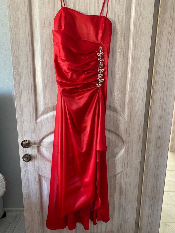 Drapeli, ince askılı ve straplez yaka detaylı bu kırmızı uzun abiye elbise, parlak kumaşı ve işlemeleriyle modern klasik şıklık sunar.