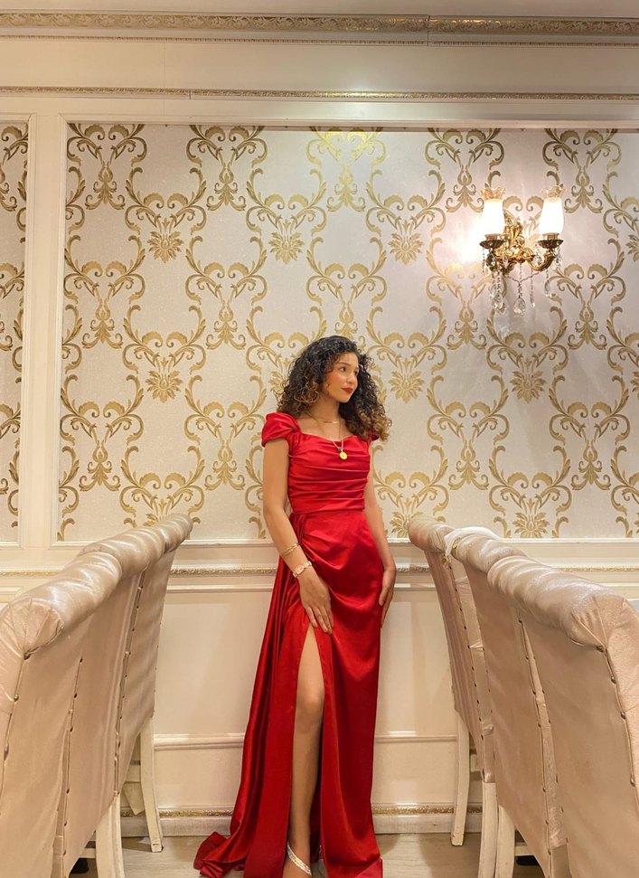 Drapeli, kayık yaka ve ince askılı uzun, kırmızı parlak kumaştan abiye elbise. Düğünler için şık ve modern klasik tarzda bir seçenek. ✨bir defa giyildi