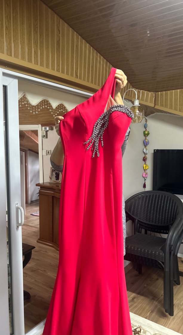 Kırmızı Drapeli Uzun Abiye Elbise