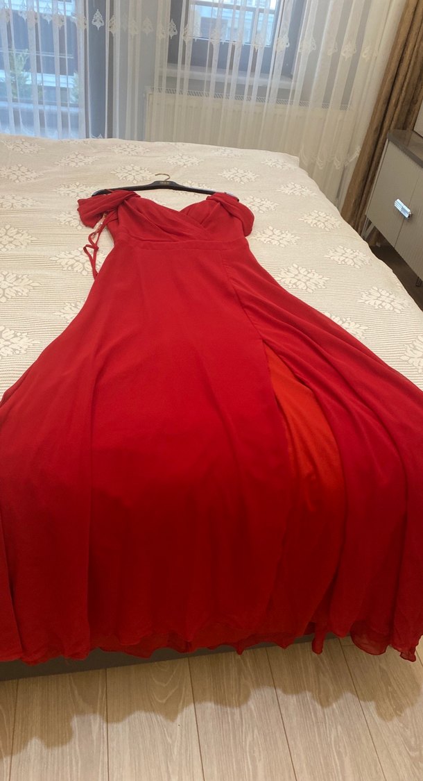 Klasik zarafette, askılı ve düşük omuz tül detaylı yırtmaçlı 1 kere giyildi kına gecesinde giydim