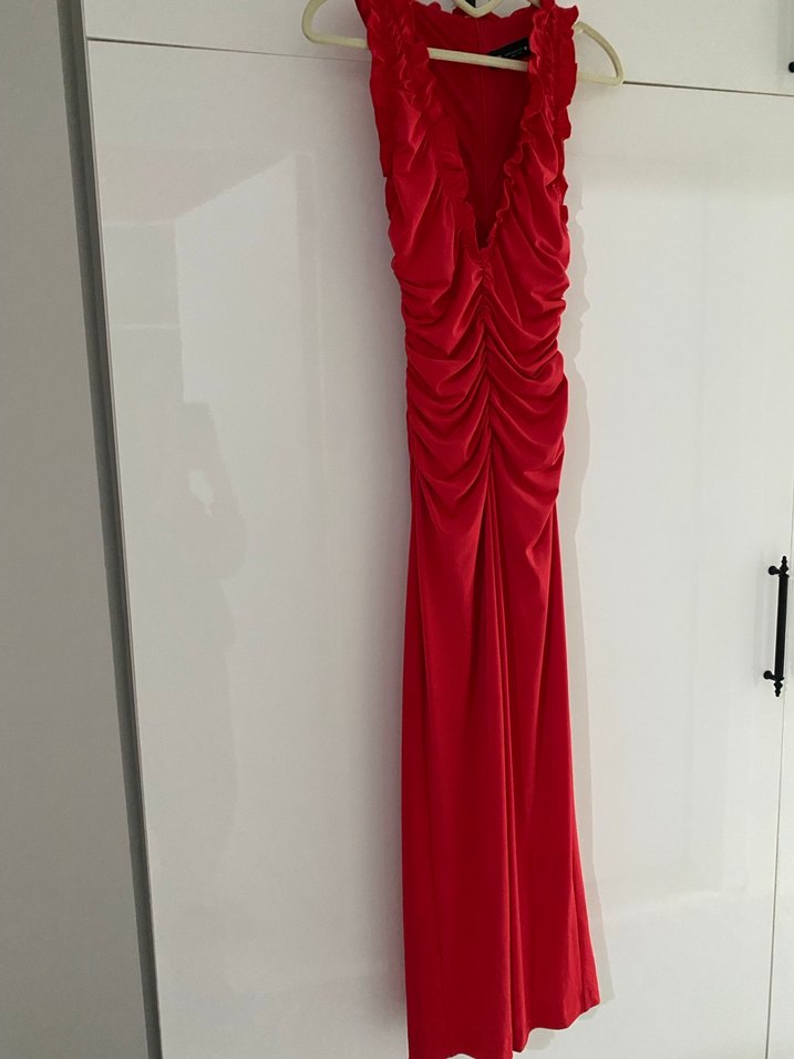 Kırmızı, parlak kumaştan, V yaka ve drapeli detaylara sahip, klasik kesim uzun ve kolsuz abiye elbise.