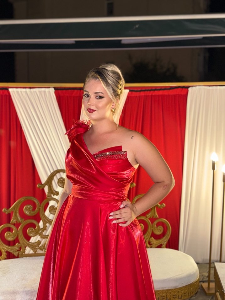 Kırmızı, drapeli ve parlak desenli kumaştan yapılmış, straplez ve vücuda oturan uzun abiye elbise. 3 numara.