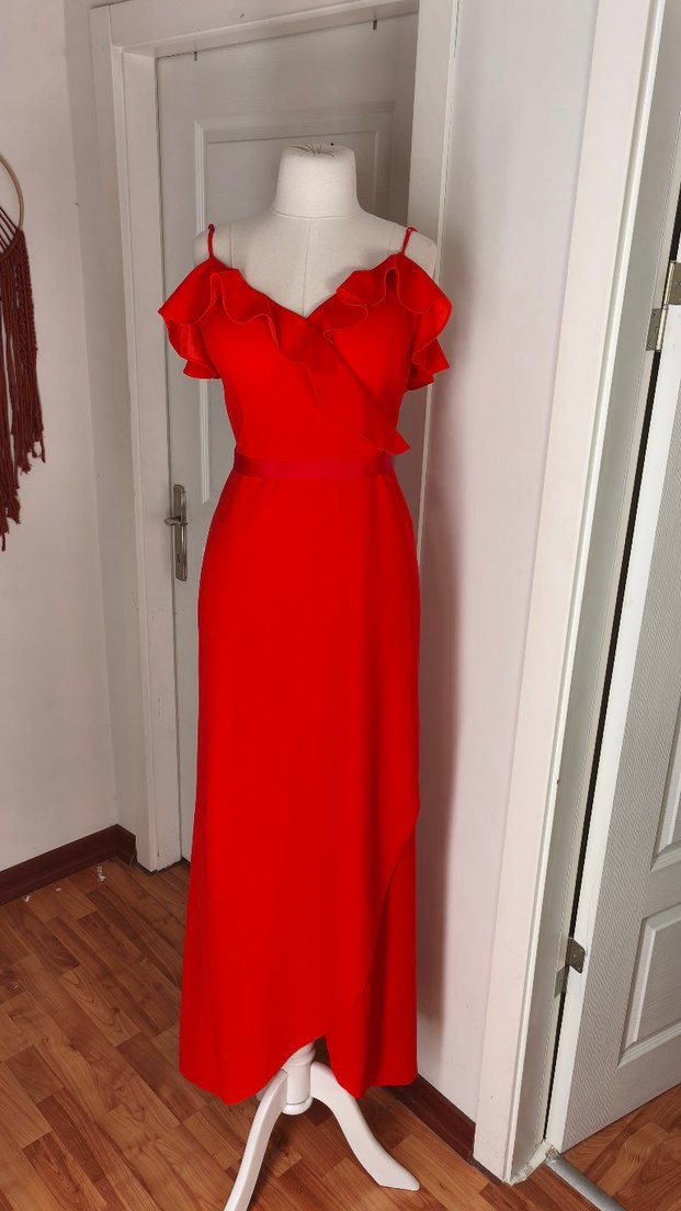 Kırmızı Drapeli Uzun Askılı Abiye Elbise