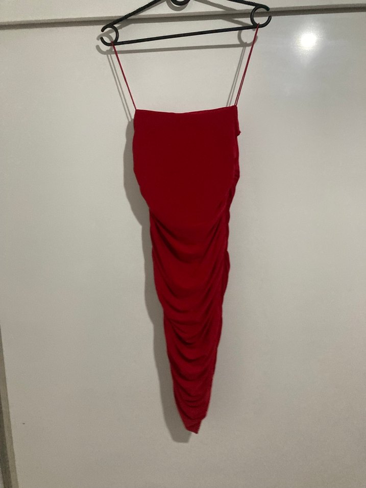 Kırmızı, drapeli ve askılı uzun abiye elbise. Straplez yaka ve vücuda oturan kesimiyle romantik akşamlar için uygundur. ❤️ Doğum gününde sadece 2 saat giyildi muazzam bir elbise bir butikten satın almıştım