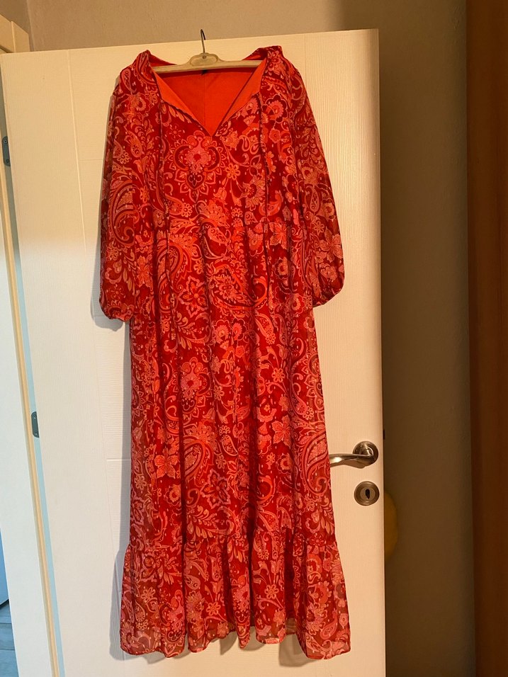 Kırmızı tie-dye desenli, sentetik kumaştan uzun, bol kesim elbise. Drapeli tasarımı, uzun kollu ve V yakalı, romantik akşamlar için uygun.