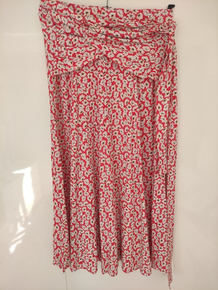 Yumuşak sentetik kumaştan yapılmış, renkli batik desenli, drapeli uzun kırmızı midi etek. Rahat kesimiyle bohem tarzına uygundur. Baglamalı korseli