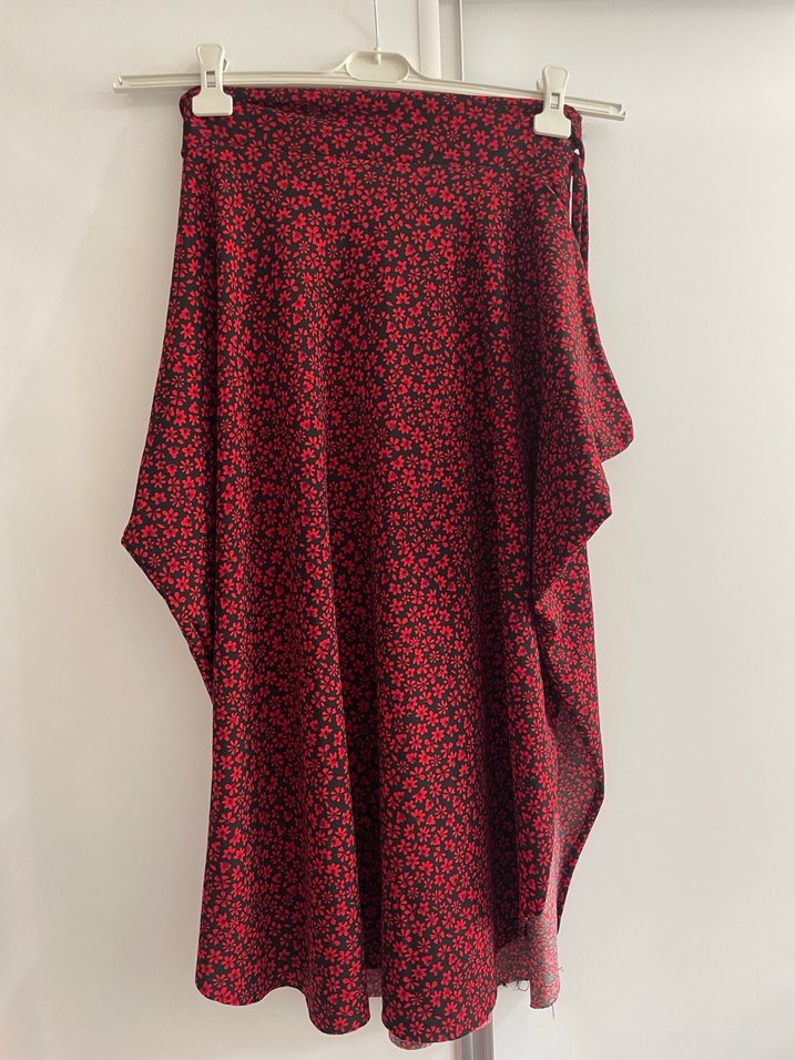 Sentetik kumaştan, kırmızı tonlarında desenli, uzun ve bol kesim drapeli eteği. Çok beğenerek almıştım 1-2 kere giydim günlük hayatımda çok etek giyen birisi olmadığım için kullanamadım