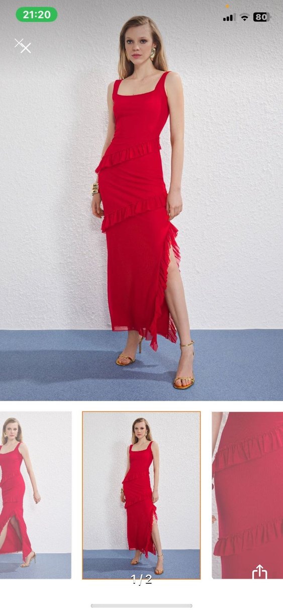Parlak kırmızı renkte, drapeli detaylara ve ince askılara sahip uzun, ince kesim elbise. göründüğü gibi hoş bi elbise kına gecesinde giyildi kurtarıcı parça..