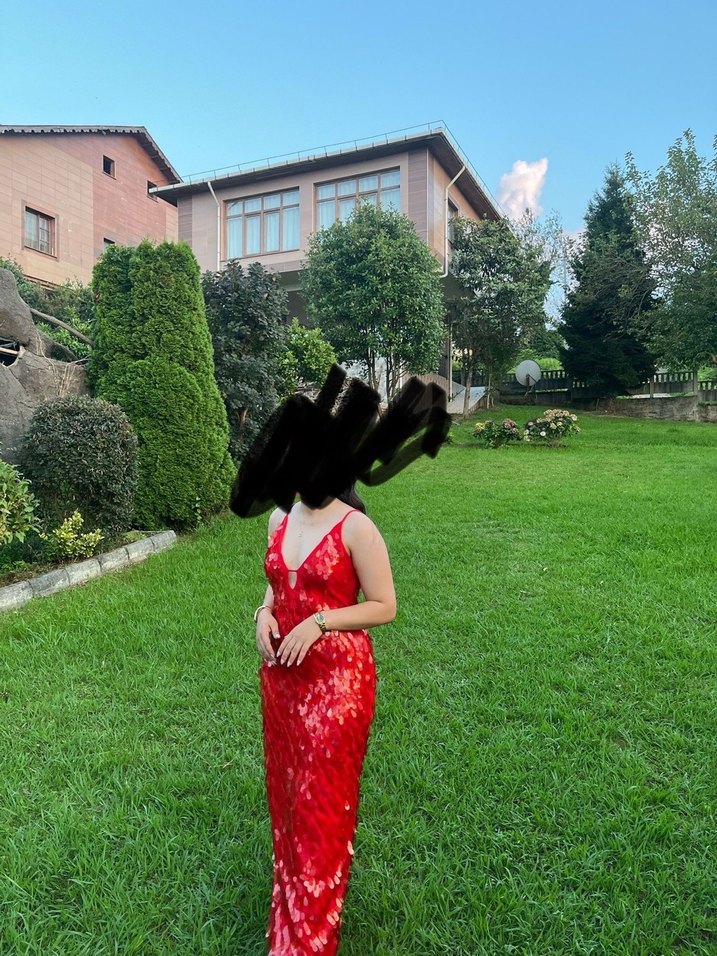 Kırmızı parlak kumaştan, drapeli ve V yakalı, uzun ve dar kesim kadın abiye elbise. Modern ve şık bir düğün tercihi. Daraltma işlemi yapılmıştır açılma payı vardır 165 boy 65 kiloya giyilmiştir