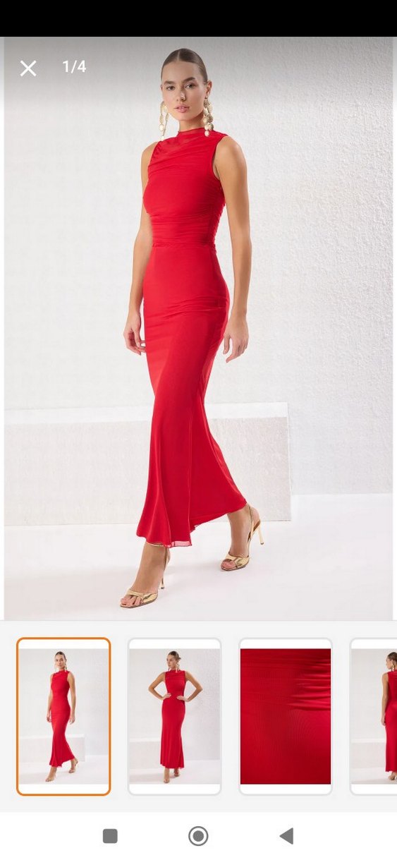 Drapeli tasarıma sahip, V yaka ve kolsuz kırmızı uzun elbise. İpek gibi parlak kumaştan, minimal ve çarpıcı bir görünüm sunar. ❤️